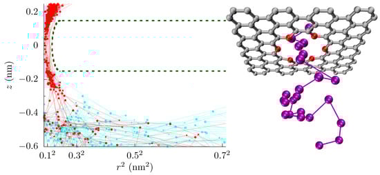 We performed all-atom molecular dynamics (MD) simulations using the NAMD2 simulations package []. The details of the simulations were the same as in Ref. []. We applied a voltage between 0.1 V to 1.0 V and calculated the ionic current for a 1 mol/L KCl solution by counting the ions that crossed the pore. Since the pore rim is negatively charged and sub-nanoscale in size (i.e., the electrostatic interactions are not significantly screened), only cation currents were present in all cases. We calculated the free-energy barrier using the adaptive biasing force (ABF) method [] in a cylinder of radius 0.28 nm and height 3 nm, centered at the pore. A portion of our simulation cell and a set of ion trajectories are shown in Figure 1. We employed the golden aspect ratio method, as it is the only method that can properly capture bulk access effects [,], and without it, one cannot explore bulk diffusion limitations with all-atom simulations.