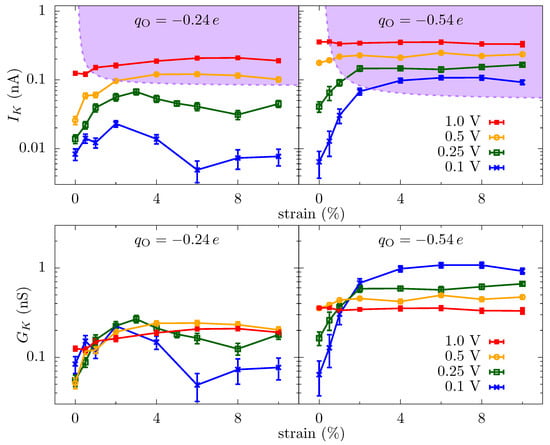 We calculated the ionic current and free-energy barrier at various homogeneous strains from 0% to 10% on the graphene membrane (we note that most of the features we observe occur at strains of 4% to 6%, and graphene can survive strains above 20% [,]). The strain was within the membrane and thus tended to enlarge the pore (albeit by small amounts) and expand in-plane distances between atoms. In the unstrained pore, the nominal pore radius (measured from the pore center to the center of the oxygen atoms) was approximately 0.29 nm and increased by about 7.5 pm for each 1% strain (this reflects a small—a factor of ≈2—geometric amplification []). This yielded nominal pore sizes from 0.29 nm (at 0% strain) to about 0.37 nm (at 10% strain), with a roughly linear relationship with strain. Though the change in pore size was minuscule, the energy landscape changes substantially. The landscape also depended on the pore charge, which is, however, not known. For the crown ether pore in graphene, the charge per oxygen atom () could be between and [,,,]. We thus used two representative test charges, and . In the former, there was an energy barrier, and in the latter, there was a potential well at the center of the unstrained pore. Each of the 12 carbon atoms—the ones adjacent to the six oxygen atoms in the pore—had charge , and the rest of the carbon atoms were neutral. When we refer to the pore charge, we are referencing the local polarization of charge from the carbon atoms of the graphene near the pore and the oxygen atoms on the pore rim. For each data point (i.e., for a particular value of , strain, and voltage), we performed five parallel production runs for a total simulation between 250 ns to 500 ns. This allowed for an error estimation using the standard error, , where var is the variance between the parallel runs.