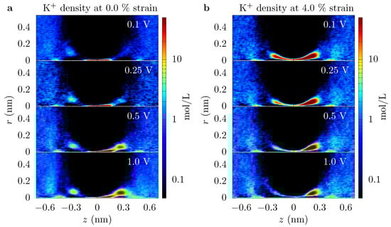 Voltage dependence of the ion concentration. Concentration of potassium ions near a graphene crown ether pore with at (a) 0% and (b) 4% strain for various voltages. For 4% strain, where we see diffusion limitations of the ionic current, we also see the depletion of ions in the pore as the voltage increases. See the Supplemental Material (SM) for additional plots with different parameter values.