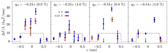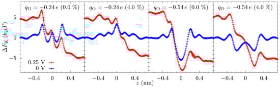 The equilibrium free-energy profiles (blue lines in Figure 4) exhibit a potential barrier for and potential well for at the center of the pore in the unstrained membrane. In the former, the electrostatic energy (between the ion and the pore charges) is less than the dehydration barrier, while the opposite is true for the latter. Additionally, there can be small potential wells just outside the pore where the ion maintains a larger hydration yet stays close to the negatively charged oxygen atoms of the pore. The energy landscape changes markedly with strain, which is primarily due to the change in the electrostatic interactions within the pore and dehydration outside of the pore. An increase in the pore size—by picometers—due to the strain causes the attractive electrostatic energy to decrease rapidly. The dehydration energy penalty in the pore also decreases with strain but, for small strain, it does not change as rapidly as the electrostatic energy. Consequently, there is a net increase in the energy of the ion at the center of the pore. As a result, the barrier in increases, and the potential well in flattens and then disappears at large strain (a dehydration-based barrier does appear in the middle of the pore, a feature which is already present in the pore at 0% strain due to the lower electrostatic compensation). In contrast, the effect of the strain on the free-energy outside the pore is in the opposite direction. The barrier outside the pore decreases with strain as ion can hydrate better with reduced hindrance from the pore oxygen atoms. The electrostatic energy, however, does not change as rapidly as in the center of the pore. The basic mechanism behind these large changes in free energies is that at the 0.1 nm to 0.5 nm scale; picometer changes in atomic configuration result in large changes in electrostatic and dehydration energies []. Dielectric screening (from the solution), in particular, is not that effective at this length scale.