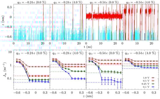 Alternatively, one can think of this scenario as one where the voltage drop in bulk on one side of the membrane is , which comes from taking the exact—assuming a continuum with bulk resistivity —voltage drop on one side of the bulk and approximating the current as in Equation (12). This partial voltage drop then supplies ions at a rate determined by its bulk, access resistance, (note that here as we are dealing with one side of the membrane). This yields a bulk rate identical to Equation (13). The bulk resistivity is m for 1 mol/L KCl in rigid TIP3P water []. Putting in approximate values nm (see, e.g., Ref. []) and nm yields either ions/(Vs) when using just the K resistivity () in Equation (12) or ions/(Vs) when using the KCl resistivity as the pore resistivity (in the bulk, we use ), which is in reasonable agreement with the extracted value of ions/(Vs). Again, some parameters, such as and , may be different, including when one is looking at different characteristics (access versus pore resistance), but at most this will give an order one change—for instance, employing nm and would give ions/(Vs). In these estimates, we do allow , but this is imposed from above rather than a consequence of free energy barriers or concentration gradients, both of which have more complex repercussions. Computing these even within a continuum picture would require a self-consistent solution, including without local electroneutrality. Barriers in the pore, though, are easy to incorporate, they lower the current and thus lower the drift-induced feeding (equivalently, they reduce ). The proximity of the estimates, though, suggests that the pore in the plateau regime is similar to that of a small open pore—“open” meaning no free-energy features. While the pore does have energetic features for smaller strain (i.e., 2% to 6%, see the SM), this entails that those features are irrelevant in the sense developed above. For larger strain (8% and 10%), the pore is basically barrierless, even in a more strict sense (see the SM). The agreement between treating the drift rate as that in response to a small but otherwise open pore ( nm and nm) may be coincidental, however, as the ion crossings happen at a smaller scale in the middle of the pore (≈0.02 nm). We will discuss this further below.