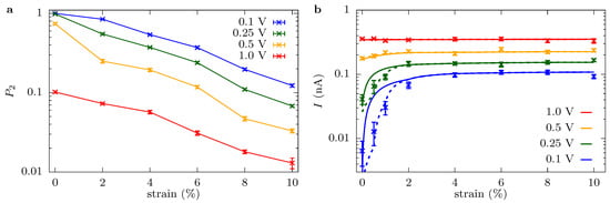 where is the occupancy of the site 1, 2, and 3, () is the incoming (outgoing) rate from bulk on the association side, and () the dissociation side. Again, the set of equations assume only one way motion into (the association side), and out of (the dissociation side), the internal pore site . Backward fluctuations can easily be included, but this adds extra parameters to be fitted and will only influence the fit in a minor way. We will apply this model only to the behavior of the pore, since the pore has more intricate behavior that would ultimately require association rates that are strain-dependent, i.e., that depend on the variation of the free energy landscape. We have discussed the pore extensively already in Ref. [], including the origin and scale of the free energy variation. We only note here that, as seen in Figure 2, the 0.5 V and 1 V biases for also give an entrance-limited region. The magnitude of the currents in this region are lower than by only an order one factor for the same voltages and strain. The similarities in current are expected for bulk-limited behavior. The fact that they are lower by a small amount is likely due to the increased capture effectiveness of the higher charge pore. The specific estimates for parameters will thus apply in this case, albeit with some small modifications of effective radii and rates.