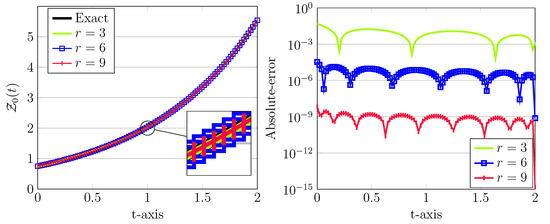 These approximations together with the corresponding absolute errors are depicted in Figure 1. Clearly, as r increased, more accurate results will be obtained. Note, in all cases, the step size is taken as . Moreover, we emphasize that numerical solutions for this model problem based on the fractional spline collocation scheme have been proposed in Reference [] with achieved absolute errors larger than , see Figure 2 in this paper. The parameters used in this approach related to were , which obviously are much more greater than our used parameters.