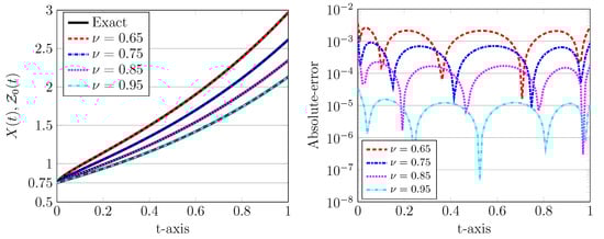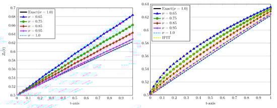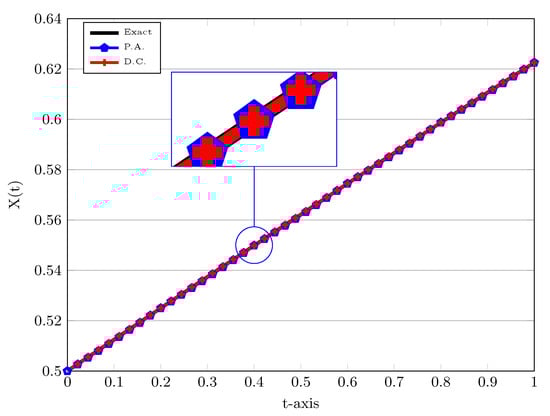 In the next experiment we show the impact of the fractional derivative on the approximated obtained solutions. In Figure 6 we present the approximated solutions at , with different values of the fractional derivatives as well as . In these plots, we also compare the performance of two P.A. and D.C. approaches for these values of . In each case, for the exact solution is also shown by a solid line. To justify our computed results, the implicit product-integration of trapezoidal (IPIT) rule with the step size is used [].
