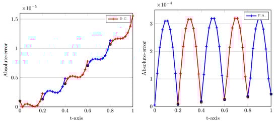 In the next experiment, we plot the absolute errors when utilizing two approaches D.C. and P.A., as one observes in Figure 4. The computational parameters are the same as those applied for Figure 3. In Figure 4, the left plot corresponds to the D.C. and the right plot is when we use P.A. technique. Note that in all plots we have divided further each interval into ten subinterval uniformly to see the behaviour of the corresponding curves more precisely.