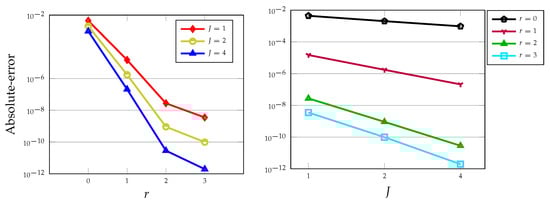 Absolute-errors versus polynomial degrees r for (left) and against the number of elements J for (right) evaluated at and for .
