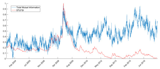 As explained above, we aggregate the mutual information and transfer entropy time series both at the bank and system level. This produces measures that summarize the behaviour of the entire network and can be compared with the overall financial system stress indexes. For example, from Figure 2 it is possible to see how the network total mutual information resembles very closely (especially in the trends) the STLFSI. We can see from the figure that the trends are very similar and timely coincident, especially around the stress peaks registered during the 2008 financial crisis. This result is coherent with Reference [66] where the authors show that correlation spikes tend to predict or coincide with significant economic or market events, especially during the 2007–2008 financial crisis.
