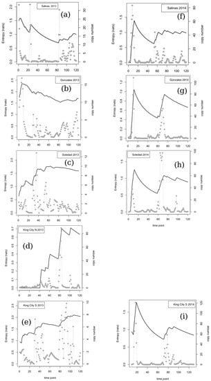 Detrended daily pathogen DNA copy number trapped (right axis scale) and cumulative entropy (nats, left axis scale) in the copy number series for 9 location/year combinations in which vortex air samplers were used to sample for the presence of DNA from the downy mildew pathogen of spinach, P. effuse, in the Salinas Valley of California: (a–e), 2013; (f–i), 2014. The King City, North location was sampled only in 2013.