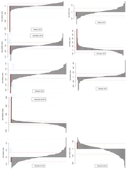 Time series graphs for the nine series of spore trap DNA copy number data are shown in Figure 1. Two of the nine series did not require detrending prior to analysis, these being King City South, 2014 and Gonzales, 2014. The results of testing for evidence of nonlinear dependence using Cao’s method are shown in Table 1 along with other summary parameters of interest for the nine series. For four series—Salinas 2013, Soledad 2013, King City North 2013, and Gonzales 2014—the surrogate (bootstrap) test led to rejection of the null hypothesis that the data were compatible with a stochastic linear (i.e., time-reversible) process. The output from the bootstrap analysis for each series is shown in Figure 2.