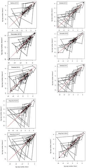 In contrast to the more or less consistent pattern revealed by the 2014 data, the cumulative entropy values for the 2013 data sets were more variable. The final values for the five series tended to be higher than those in 2014 ranging from 1.00 to 2.04 nats with the exception of the King City North location, which had a final entropy value of 0.63 nats. In Salinas and Gonzales, the entropy value peaked early at over 2 nats and declined somewhat over the course of the season, although still finishing at or above 1.00 nats. In contrast to this early peak and decline pattern, at the remaining three sites in 2013, uncertainty increased through much of the season, in association with repeated oscillations in the trap copy number data.