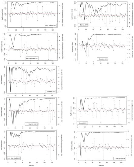 All of the series had positive Lyapunov exponents, indicating a tendency for deterministic sensitivity to initial conditions []. On the other hand, application of Cao’s approach [] indicated that the series were stochastic. The surrogate (bootstrap) test of time reversibility indicated that five series were compatible with the hypothesis that they were generated by a stochastic linear process while four were not. Relatively low values for the coefficient of prediction and adjusted-R2 calculated from linear autoregressive models, ranging from a minimum of 3.6% (Gonzales, 2013) to a maximum of 26.4% (King City, N, 2013), also suggested that the series were strongly influenced by stochastic noise. Taken together, these results indicated that the series lie in the transition between stochastic and deterministic uncertainty in what Turchin [] refers to as quasi-chaotic territory at the boundary between the two types of dynamics.