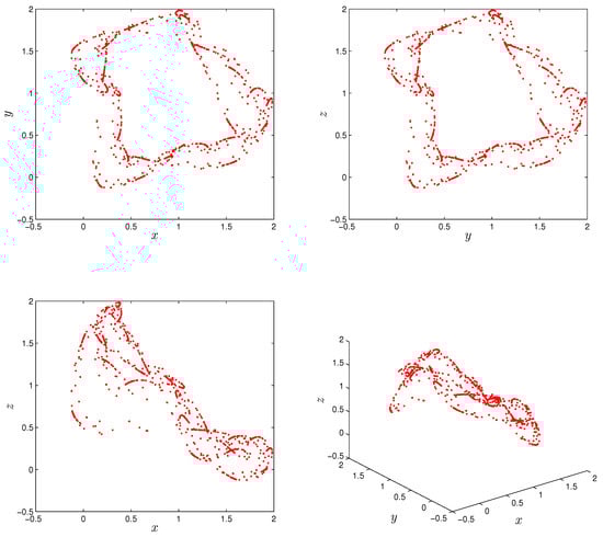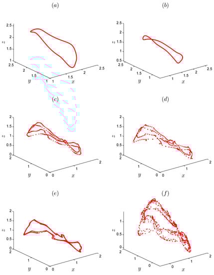 Here, the dynamics of the FoDT system given in (5) are analyzed using the coefficient  and , with three different values of initial conditions. The coexisting bifurcation diagram, shown in Figure 8a, is obtained by varying r in the interval , where the blue, green and red diagrams are drawn according to the initial conditions ,  and , respectively. Regarding with r again, the behavior of dynamical system (5) can be exhibited by the largest LE graph shown in Figure 8b. One can observe that when , the largest LE changes its values between positive and negative numbers, which indicates that there is a transition from chaos to periodic to chaos with the various values of r. When , system (5) is chaotic as its largest LE is positive. At , system (5) exhibits periodic motions. Moreover,  when we choose , we can obtain a chaotic attractor for the initial condition  and a periodic orbit for , as shown in Figure 9d. Further, as r decreases through the interval , system (5) has two different types of attractors coexist with respect to the initial condition  and , as shown in Figure 9c.