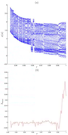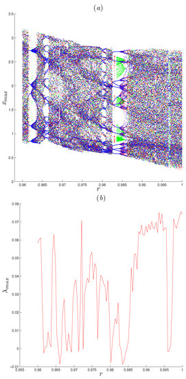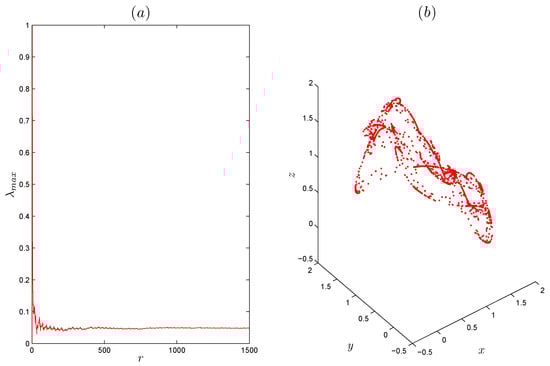 Figure 2b shows the largest LE of system (5) that was calculated using the above method with MATLAB, from which it can be seen that the system has positive LEs when r takes its highest values, indicating that the system converges to hidden chaotic attractors, which is consistent with the corresponding bifurcation diagram. LEs are negative or equal to zero for the remaining ranges, which indicates that the system has limited cycles and periodic attractors, as shown in Figure 3. Taking  as an example, Figure 4a shows the estimated largest Lyapunov exponent and the phase portrait, respectively. Obviously, the corresponding largest Lyapunov exponent is positive, which shows the the fractional system (5) is chaotic in this case. All Lyapunov exponents are plotted in Figure 5 for varied r to validate these results.