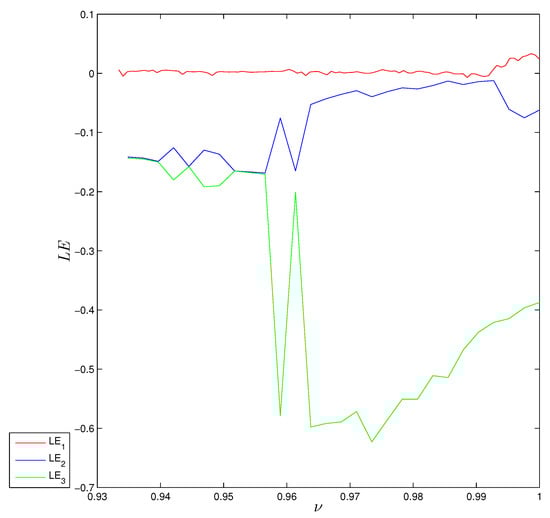 Although bifurcation plot and phase portraits are useful tools in determining the existence of chaos and quantifying it, the most agreed upon tool is the “Lyapunov exponent.” By definition, the three-dimensional fractional-order system (5) displays sensitive dependence on initial conditions when two trajectories that are starting from infinitesimally close initial conditions can diverge exponentially with the rate given by LLE. The Lyapunov exponents can be approximated using the Jacobian matrix, which in the case of fractional-order discrete-time systems is calculated in a similar manner to the states in (11); see []. The Lyapunov exponents can be given by