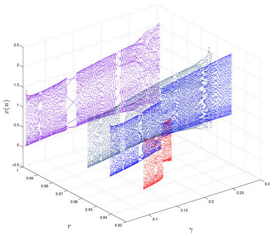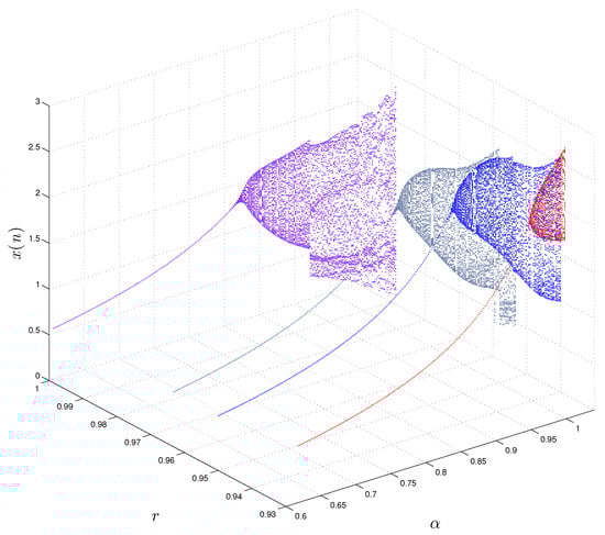 In order to further analyze the properties of the FoDT system (5), we plot the bifurcation diagrams for different values of r (i.e., ). In Figure 6 and Figure 7 we show the bifurcation diagram of the FoDT system (5) with respect to the  and , respectively. In  Figure 6, the diagrams are obtained by changing  from  to  and fixing  and  to , while in Figure 7 we present the 3D view of the bifurcation diagrams when . Different dynamic behavior, including chaos periodic windows, is observed. Moreover, we observe that decreasing the value of the fractional order lead to the disappearance of some chaotic region. In particular, the diagrams of bifurcation in Figure 6 and Figure 7 show that the bifurcation diagram of the FoDT system (5) shrinks as r decreases.