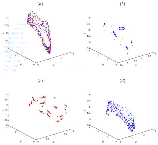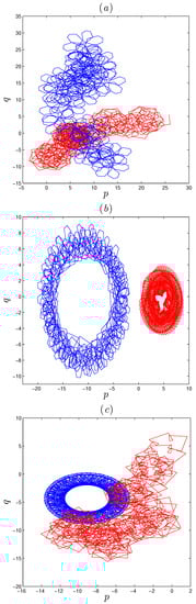The coexistence of chaotic attractors in system (5) can be validated by plotting the translation components of this test in a plane in which p and q are its axises. As in Figure 9, we have fixed the system’s parameters  and  equal to  and  respectively, and have constantly varied r. Figure 10 illustrates the results of the 0–1 test for system (5) in which the blue and the red diagrams are drawn according to the two initial conditions  and , respectively. In particular, Figure 10a depicts Brownian-like trajectories for both initial conditions, confirming the coexistence of two chaotic attractors for . On the other hand, Figure 10b depicts bounded-like trajectories for the same two initial condition, confirming the coexistence of two periodic attractors for . Finally, the coexistence of chaotic and periodic orbits is confirmed in Figure 10c, which depicts bounded-like trajectories for initial condition  and Brownian-like trajectories for , when .