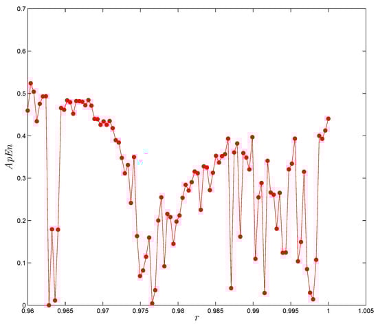 ApEn of the FoDT system (4) versus r, for system parameters ,  and , and initial conditions .