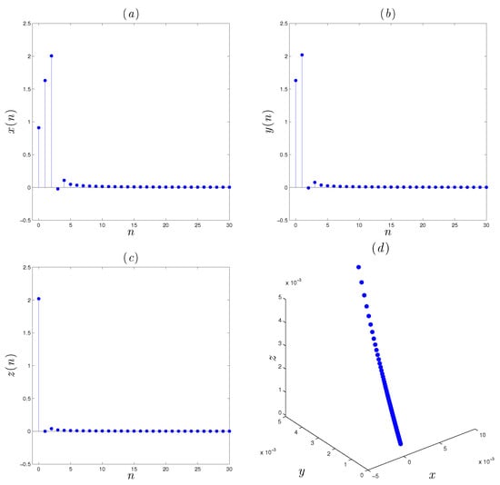 In [] the authors Haibo Jiang et al. preformed a schematic approach to find three-dimensional integer-order chaotic maps with no equilibrium or with stable equilibria. In this approach, an exhaustive computer search was carried out to obtain the “elegant” chaotic cases by considering numerous combinations of the coefficients and initial conditions []. Motivated by this strategy, we consider the following integer-order system: