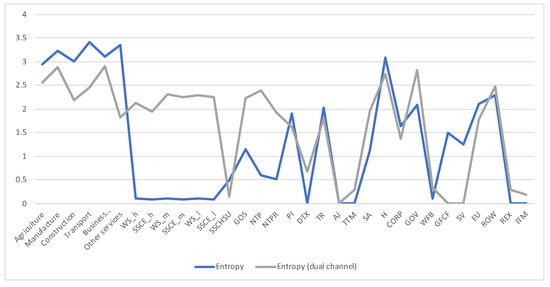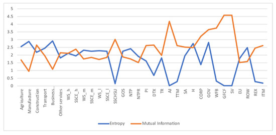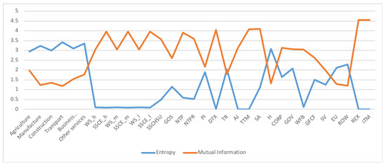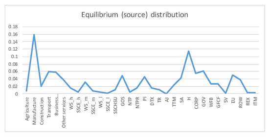 A first example is the analysis of SAM 2010 matrix for Austria, data obtained from [29]. The SAM matrix contains 32 sectors, see Figure 3. We checked that the SAM coefficient matrix A corresponds to an ergodic Markov chain, by taking the powers . For the rows are practically equal to the stationary distribution given by the normalized totals of the rows, and thus the stationary distribution is unique and is the equilibrium distribution, which acts as source to the channel. Then we computed the quantities of the information channel, see second column of Table 1. The entropy of the source is 4.290 (out of a maximum possible entropy of ), which splits into the entropy of the channel, 2.136, and the mutual information. From the high value of the entropy we can deduce a relatively homogeneous distribution between sectors, see Figure 4. The equilibrium distribution has some spikes at Manufacture and Household sectors. We observe also that the relationship of the entropy of channel value to the mutual information value is practically equal to 1. In terms of channel interpretation, we could say that both randomness and determinism take equal share on average. It might be a characteristic of a developed market. If we consider the SAM coefficient matrix as describing an economics complex system, for the effective complexity to be sizable, the system must be neither too orderly nor too disorderly [30]. We can see in Figure 5 the sector by sector distribution of entropy and mutual information. A high entropy (and thus a low mutual information) would mean a highly distributed output from the sector. A high mutual information (and thus a low entropy) would mean a highly focalized output from the sector. From Figure 5 we see that only in half a dozen sectors entropy and mutual information are equal, while in the other sectors either one or the other predominate.