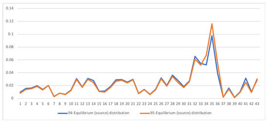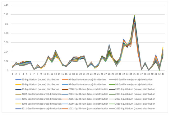 The equilibrium distribution for SA SAM time series with current prices for 1994-1995. Each line corresponds to a year (see the legend in the graph). The horizontal axis represents the sectors, their description is in Figure 11. Enterprises and Households sectors (sectors 34 and 35) increase their weight while Savings sector (sector 41) decreases.