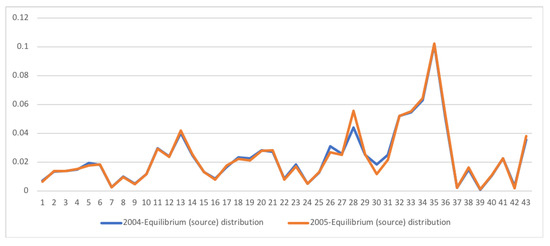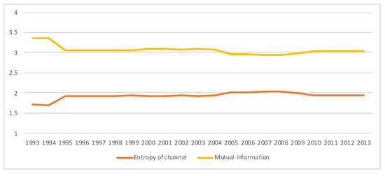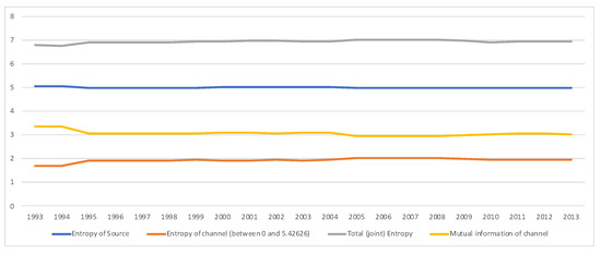 - Entropy of the source, . Entropy of equilibrium distribution measures average uncertainty (as an a priori measurement) of input random variable X, or alternatively information (as an a posteriori measurement) of output random variable Y, both with distribution . It measures how homogeneous is the importance between the different economic actors. The higher the entropy, the more equal are the actors. A low entropy means that some actors are more important. We can normalize it by the maximum entropy, , where M is the total number of economic actors.