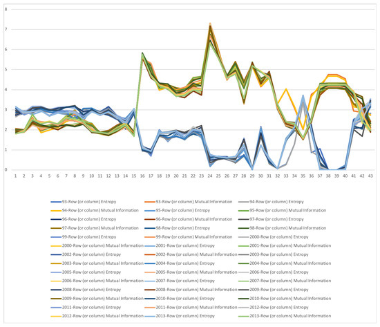 We show in this section examples for Austria SAM 2010 matrix and South Africa SAM time series matrixes 1993–2013. Please note that as we work with the transpose of the original A matrix, when we talk about entropy or mutual information of row we refer to the corresponding column in matrix A.