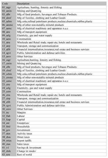 - Van Seventer, D. Compilation of Annual Mini SAMs for South Africa 1993–2013 in Current and Constant Prices; Technical Report; UNU-WIDER: Helsinki, Finland, 2015. [Google Scholar]