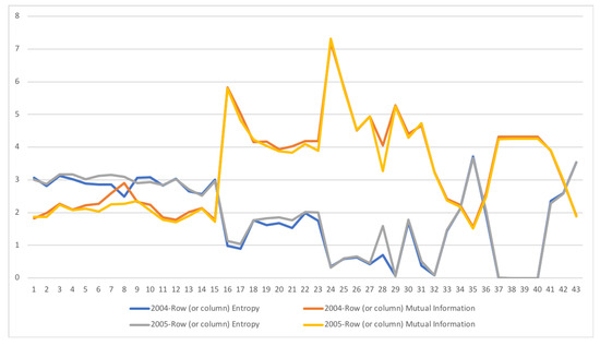 The row mutual information (warm colors) and entropy (cold colors) for SA SAM time series with current prices for 2004–2005. The horizontal axis represent the sectors, their description is in Figure 11. Each line corresponds to a year (see the legend in the graph). Changes only happen in activities (1–15) sectors and their corresponding commodities (16–30). Main changes happen in Manufacturing (3–8, 19–23) sectors, both in supply and demand, and in Financial intermediation, only in demand (28). In this last sector, entropy increased and mutual information decreased, meaning that Financial intermediation demand sector related to more sectors and in a more homogeneous way.