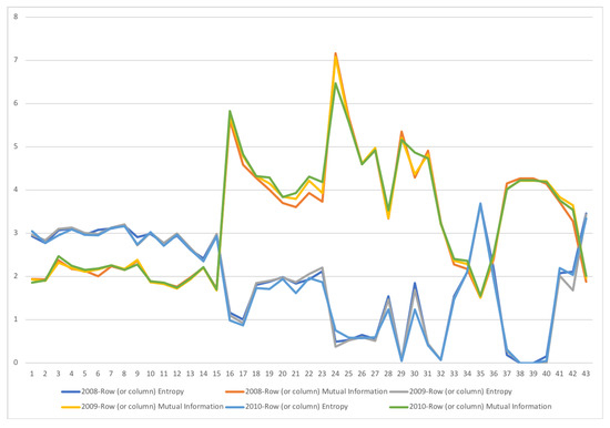 The row mutual information (warm colors) and entropy (cold colors) for SA SAM time series with current prices for 2008–2010. The horizontal axis represents the sectors, their description is in Figure 11. Each line corresponds to a year (see the legend in the graph). There is change in many sectors of the economy, although the most important changes happen in demand in sector 30, Other services, and sector 42, Change in stock. Other sectors that have noticeable changes are demand Manufacture sectors, from 19 to 22, where demand is more concentrated.