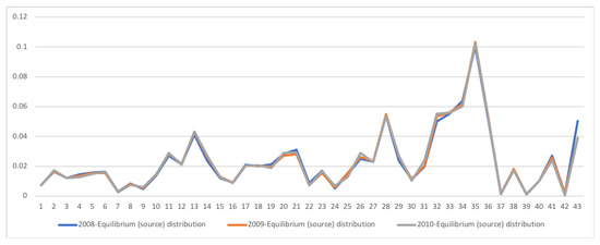 The equilibrium distribution for SA SAM time series with current prices for 2008–2010. Each line corresponds to a year (see the legend in the graph). The horizontal axis represents the sectors, their description is in Figure 11. The most noticeable change is the decrease of sector Rest of World (sector 43), and a small increase in Labour and Wholesale sectors (sectors 32 and 26).