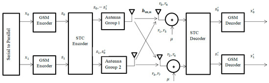 In order to achieve a high data rate and diversity, GSM-STC is designed. The GSM-STC will use two subgroups of antennas at the transmitter using the combination method [23] to achieve diversity with a high data rate and low bit error rate. Two groups will be added in the transmitter and each group has total transmitting antenna and number of active antennas per group. The transmitting symbols will be during two time slots, and , as seen in Figure 2.