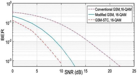 BER (bit error rate) comparison for the proposed technique (GSM-STC) with GSM techniques versus SNR (signal-to-noise ratio) using 16-QAM.