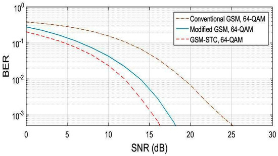 BER comparison for the proposed technique (GSM-STC) with GSM techniques versus SNR using 64-QAM.