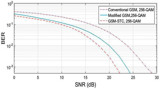 BER comparison for the proposed technique (GSM-STC) with GSM techniques versus SNR using 256-QAM.