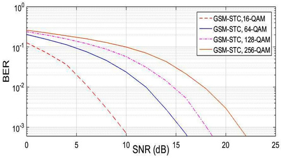 The GSM-STC technique has a better performance and matches massive MIMO requirements due to the ability to increase the data rate by the use of two subgroups of antennas at the transmitter to achieve diversity and enhance BER. The comparison between QAM modulation schemes with the same number of antennas at transmitter = 10 and same active antennas per group = 2, and also with the same number of receiving antennas = 4, is shown in Figure 7. This reveals that the 16-QAM is better than all the others.