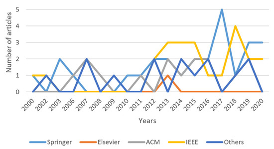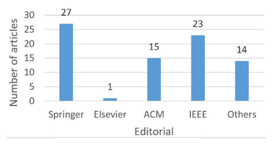 Figure 2 shows a bar graph with the distribution of the articles analyzed according to the year of publication. It is observed that in 2019 the largest number of articles is concentrated. Of the 9 articles, 3 are from Springer ([33,34,66]), the publisher with the highest number of articles, as it can be observed in Figure 3 and Figure 4; 2 belong to ACM ([76,78]); 2 to IEEE ([35,96]), and 2 pertain to the category “Others” ([95,97]).