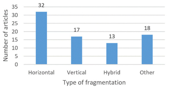 Figure 5 depicts a bar graph showing the number of articles by type of fragmentation. The most used fragmentation in the analyzed works is the horizontal one. The “Other” category shows the number of articles that use a type of fragmentation that is not any of the other three, such as the fragmentation of documents in [82,83,84,85,86,87], fragmentation of videos in [88], grid fragmentation in [95], among others. Of the papers that addressed horizontal fragmentation, 4 also included CBIR ([1,40,41,49]).