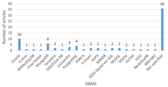Figure 6 shows the number of articles per DBMS. Most of the works do not report or do not use a DBMS to carry out their research. It is observed that the most used systems are Oracle, MongoDB, PostgreSQL, and Cassandra.