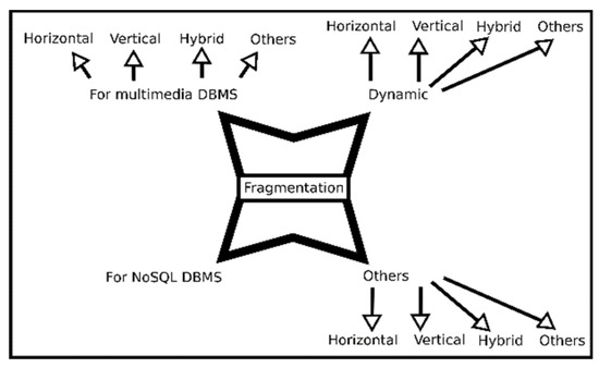 Four categories are proposed to present the works obtained. The first category contains the methods that focus on multimedia databases; the second category covers all the approaches that perform a dynamic fragmentation and that do not focus on multimedia data; the third category contains all the works that consider NoSQL databases, that do not perform dynamic fragmentation and that do not take into account multimedia elements; the last category shows the works that are not included in any of the previous categories. Each category is subdivided by type of fragmentation, i.e., horizontal, vertical, and hybrid. The third category is not subdivided due to the nature of NoSQL databases.