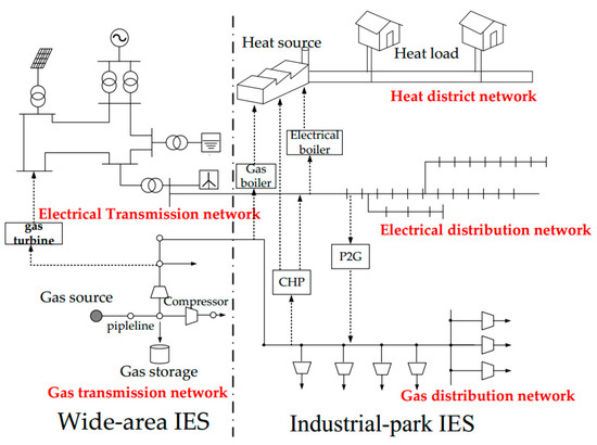 Consequently, there is a need for energy systems to evolve from individual systems with little or no interdependencies into a complex set of integrated systems on large scales. On the basis, integrated energy system (IES) is proposed, which involved electricity, natural gas, and heat. The production, transmission, and consumption of the system can be optimized by IES as a whole, which is the key of the third industrial revolution [1]. At present, researches and works on IES can be divided into two characteristics based on application scenarios as [2,3] wide-area IES and industrial-park IES. Wide-area IES mainly includes the electricity transmission network and gas transmission network. Industrial-park IES involve the coordination of multiple regional energy systems on distribution network and can be seen as upgraded microgrids. The interaction between wide-area IES and industrial-park IES is shown in Figure 1.