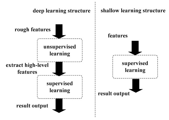 Deep learning as a frontier of machine learning technology can enable the regression of complex nonlinear functions. The framework for deep learning is similar to the hierarchical structure of human brain, the core idea of deep learning algorithm is to, first, use an unsupervised learning method to extract data representation at a higher, more abstract level and, then, to use a supervised learning model for classification or regression. The differences between the widely used shallow learning algorithms and deep learning algorithms are as follows: (1) deep learning emphasizes the depth structure of model, which usually has 5 layers, 6 layers, 10 layers, or even more hidden layers and (2) deep learning also clearly highlights the importance of feature learning in building a multilevel, which means mapping relations from external low-level external signals to intricate high-level features during training layer by layer. Thus, the ability of multilayer to capture highly abstracted features from training data makes classification and regression easier. A structure comparison of shallow learning and deep learning is shown in Figure 2.
