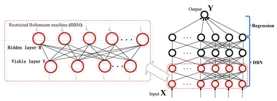 Deep learning simulates human and animal thinking, in which features of the input data are extracted from bottom to top, step by step. Deep belief network (DBN) based on the restricted Boltzmann machine (RBM) have been proposed as the basis of one widely applied type of deep learning method, at the bottom of such at model, an unsupervised DBN is employed to extract features from the data, whereas in the top layer, supervised regression is applied to generate the prediction results. The structure of such a deep learning regression forecasting model is illustrated in Figure 3.