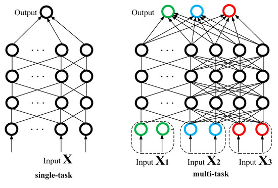 Multitask learning is classical branch in data mining and artificial intelligence [24]. The implementation of the same network to perform classification and regression for multiple tasks provides the opportunity for multitask learning. During the learning procedure for one task, information on other tasks can be included in parallel via shared weights to improve the learning accuracy. This is a classic paradigm in machine learning. A comparison of multitask and single-task architectures is shown in Figure 4.