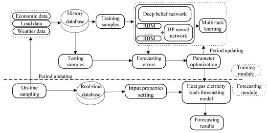 In deregulation environment, it is necessary to implement load forecasting function for energy marketers, load aggregators, and independent system operator (ISO). In addition, many of these agents may lack computing experience and access to high-performance servers. The investigation of such scenarios will require the development of a universal model that is suitable for application by a wider variety of entities. Based on the relevant application demands and algorithm requirements, we propose a two-stage short-term hourly load projection for multiple energy types. The method takes the idea of a deep multitask learning framework composed of modules for off-line training and on-line prediction. whose structure is shown in Figure 5.
