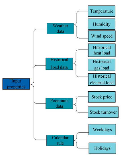 The input variables can make maximum use of the information provided by cyber-physical systems and numerical weather forecasts. The input features include historical load data, weather data, calendar rule, and economic data. The historical load data comprise historical datasets of heat load, gas load, and electrical load. The weather data consist of temperature, humidity, and wind speed. Weekdays and holidays (weekends and public holidays) are classified by calendar rule in accordance with the public holidays observed in China. In addition, for economic data, depending on the size of the region, one can use regional GDP data, the stock prices of corporations, or other financial data. Considering that the industrial park belongs to listed company, we also add some economical index into dataset, such as stock price. The input variables can make maximum use of the information provided by cyber-physical systems and numerical weather forecasts. The setting of input properties is shown as Figure 6.