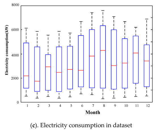 The experimental dataset is collected from the industrial-park IES demonstration project of Goldwind Technology Co., Ltd., in Daxing District, Beijing, China, consisting by electricity, natural gas, and heat. The interactions among the various energy carriers in this industrial-park IES demonstration project are shown in Figure 7. CHP, electric boiler, and gas-fired boiler are established as energy-conversion facilities to meet the demands for transformation among various energy sources. The industrial-park IES is configured by storage station to develop economic benefit as a whole. The PV and wind generator are also configured in IES to utilize the renewable energy resource. It is noteworthy that although industrial-park IES includes the industrial production module, the community also hosts office part and residential zones. Energy loads in different period of year are shown in Figure 8.