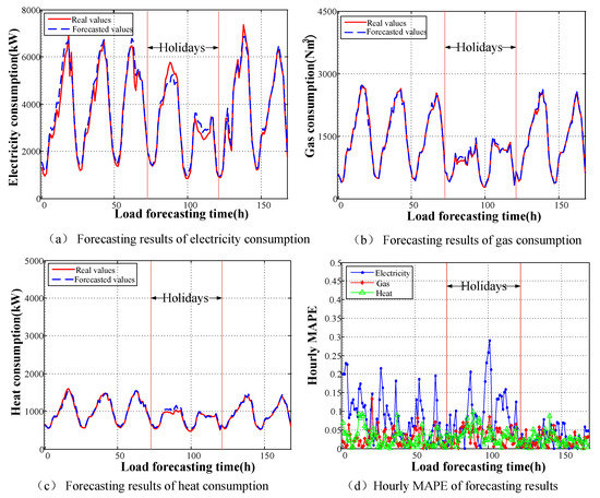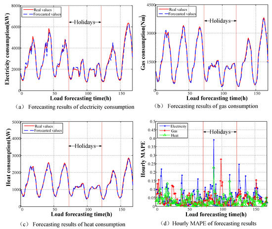 - From Figure 9 and Figure 10, we can see that the fluctuations in electric load are more severe than those in the other loads during all periods. This is because the inertia of the heat and gas loads is greater than that of the electrical load, and the diversified nature of the storage of gas and heat ensures sufficient reserves for operation. Thus, the gas and heat load forecasts have less error. The MAPEs of different pattern for the electrical load, gas load, and heat load are shown in Table 3.