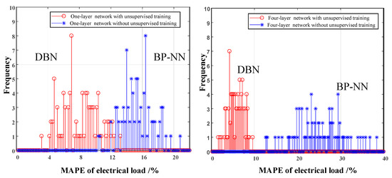 The following comparative analysis focuses on the details of the underlying advantages of the deep learning algorithm compared with the shallow learning of BP-NN, the main difference between deep learning and BP-NN is whether including unsupervised learning or not as pretraining method in modeling process. Thus, we design the experiment concerning about the loads forecasting model with or without the unsupervised training to test network error for both methods.