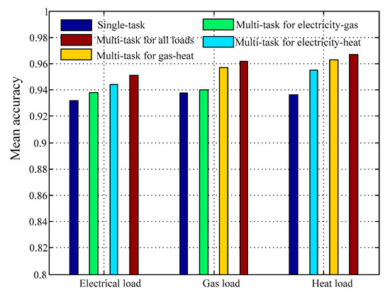 Figure 12 compares the multitask results with single-task results. The prediction accuracy of three kinds of loads is significantly improved by jointly training tasks. We can see that the MA for forecasting electricity-gas together is less than those of other multitask aggregated style for the reason that electrical flow and gas flow may have weak coupling with each other. On the contrary, complicated and diversified transformed fashion between gas flow- and heat flow-enabled multitask for gas-heat obtains relatively better forecasting results. In addition, compared with single-task, the accuracy improvement of each task for training all loads reached approximately 2.7%, which has the best performance in all multitask models. Instead of forecasting each load separately, the multitask method analyzes the complex coupling relationship among several types of input information, meaning that the training task for each type of load considers information related to the other load types. The multitask for all loads leads to a largest reduction in error, which effectively improves the accuracy of the results.