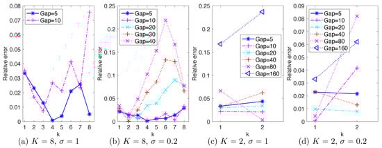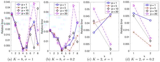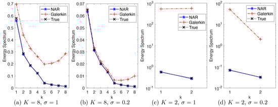 Numerical tests show that the NAR models with are numerically unstable for the setting , and the number is for the setting . Figure 4a,b shows the relative error in energy spectrum reproduced by NAR models with those stable time steps. The relative errors increase as the increases. Note that the relative errors for modes change little, but those with increase significantly. In particular, note that in (b), the relative errors at are about 8% for , but the relative errors at increase sharply to form a peak at when . We will discuss connections with CFL numbers in Section 4.5.